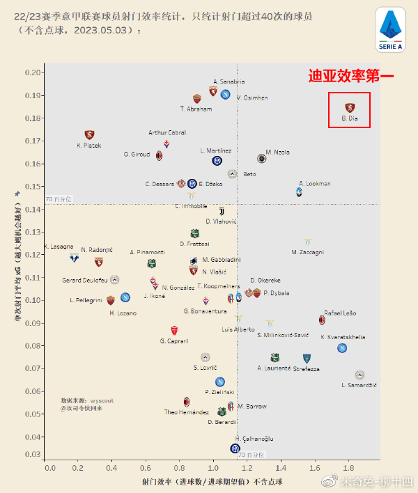 再来看看意甲赛场,从去掉点球之后的统计数据可以看到,迪亚在找寻或自己创造好的射门机会,跟射门的转换率这两件事情上,都做得极好。