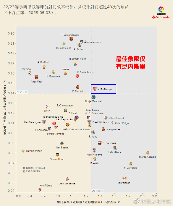 从横轴进球效率(评估射术)和纵轴单次射门XG(评估前锋的跑位能力和队友的传球质量)的统计表可以看到,仅有恩内斯里进入到象征最佳的第一象限(还是相对最靠下的位置)。