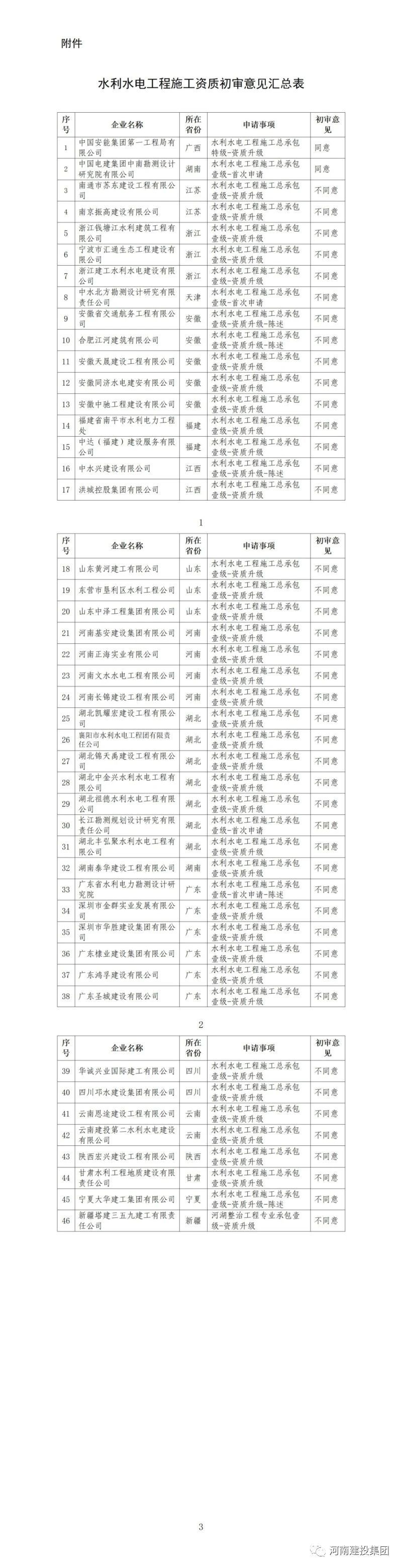 近期,我部组织对住房城乡建设部转来的46项水利水电工程施工资质申请材料进行了初审。现将初审意见予以公示(见附件),接受社会监督,公示期7天(2023年1月6日至1月12日)。