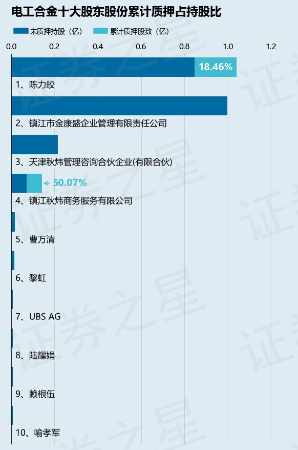 截止本公告日,股东陈力皎已累计质押股份1920.0万股,占其持股总数的18.46%,股东镇江秋炜商务服务有限公司已累计质押股份710.0万股,占其持股总数的50.07%。本次质押后电工合金十大股东的累计质押股份占持股比例见下图:
