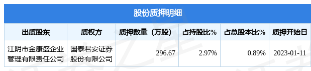 电工合金(300697)1月12日公开信息显示,股东江阴市金康盛企业管理有限责任公司向国泰君安证券股份有限公司合计质押296.67万股,占总股本0.89%。质押详情见下表: