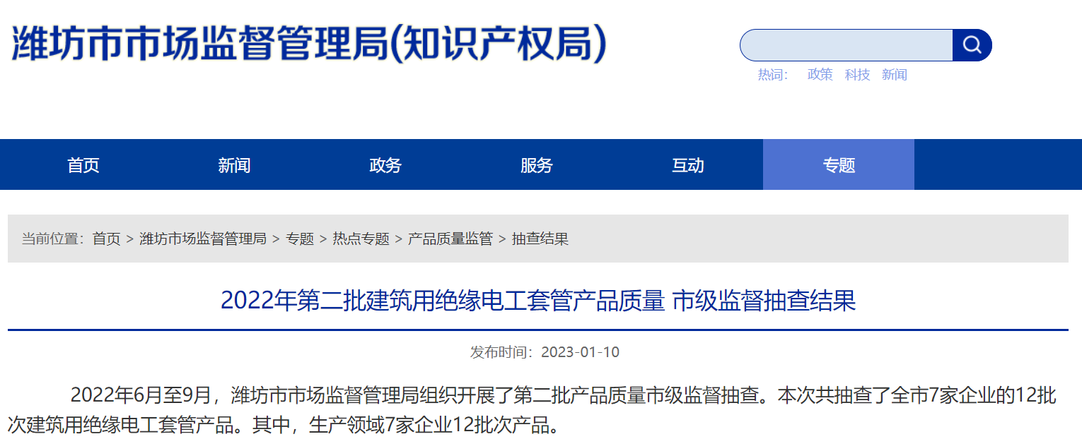 中国质量新闻网讯 2023年1月10日,山东省潍坊市市场监督管理局网站发布2022年第二批建筑用绝缘电工套管产品质量市级监督抽查结果。