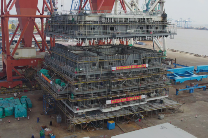 据了解,阳江三山岛海上风电柔直输电工程(海上工程)施工项目的结构主体由两个平台构成,分别为海上换流站平台和海上辅助平台。海上换流站平台是将交流电转换为直流电,是保障电力系统安全稳定运行的“心脏枢纽”,而本次封顶的海上辅助平台,是保障人员的生命安全和生活需求,以及支撑整个海上平台稳定运行的支持系统。